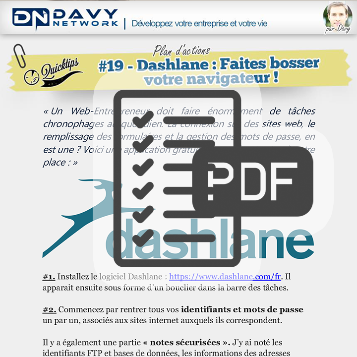 Déjà, ces données sont stockées uniquement sur votre ordinateur, pas sur le Web. Vous pouvez les synchroniser avec un accès premium mais de base, c'est comme avoir vos informations dans un fichier excel, sauf que ce fichier serait protégé par un mot de passe maître. Ensuite, les entreprises comme Dashlane font de la sécurité, leur cheval de bataille. Nous, pas tellement. Je me sens plus en confiance à laisser mes mots de passe entre les mains de Dashlane, que dans mon propre ordinateur. Il est plus probable de se faire voler son ordinateur que de voir une entreprise comme Dashlane se faire pirater. Quoi qu'il en soit, c'est une décision qui doit rester la vôtre. Pour prendre des décisions comme celle-ci, je me pose la question suivante : Que se passerait-il si le pire arrivait, et est-ce que les effets du pire contre-balanceraient les bénéfices du meilleur ? La réponse aide très souvent à passer outre ses peurs et ses doutes pour passer à l'action. Je partage davantage de détails sur la configuration de Dashlane dans le plan d'actions d'aujourd'hui. Note : Je tiens à préciser que je n'ai aucun lien d'affiliation ni d'aucune sorte avec Dashlane, il s'agit d'un retour d'expérience sur une l'une des applications, qui a eu le plus d'influence positive sur ma productivité.Web-Entrepreneur et fondateur de le plate-forme de formations Davy Network, Davy aide les entrepreneurs et les marques depuis 2010, à développer leur entreprise sur le Web, grâce aux stratégies de Marketing Internet.