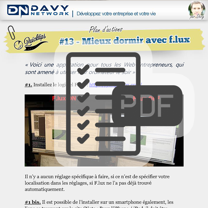 En ce qui me concerne, F.lux a totalement corrigé ce problème et m'aide à mieux dormir. Avant il me fallait parfois une heure à m'endormir après avoir éteint l'ordinateur, maintenant quelques minutes suffisent (Je fais aussi davantage de sport, donc ça joue aussi). Mais ce ne sera peut-être pas le cas pour tout le monde et l'idéal si vous en avez la possibilité, c'est de troquer votre écran pour lire un bon livre. Et dans les cas où vous n'avez pas le choix, cette application pourra énormément vous aider et vous permettre de maintenir vos efforts jour après jour, sans fatigue dans la journée !Web-Entrepreneur et fondateur de le plate-forme de formations Davy Network, Davy aide les entrepreneurs et les marques depuis 2010, à développer leur entreprise sur le Web, grâce aux stratégies de Marketing Internet.