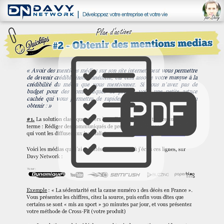 Dans cette vidéo vous apprendrez : - Le système classique pour obtenir des mentions médias, et les meilleurs sites internet pour envoyer votre communiqué aux journalistes. - L'astuce cachée, pour quand même avoir le droit de mentionner ces médias parmi vos mentions. En fait l'astuce est très simple, le tout ce n'est pas forcément d'obtenir un article de la part d'un journaliste (aléatoire et couteux), mais simplement d'être présent sur le média en question. Donc on peut imaginer plusieurs façons de le faire... comme par exemple acheter des petites annonces, rédiger un article de blog (ou article invité), voire même un simple commentaire Ces mentions médias vont instantanément booster votre crédibilité par rapport à vos concurrents, surtout si vous débutez ! Pensez à vous abonner directement sur ma chaîne Youtube pour être au courant des nouvelles vidéos (J'y poste aussi plein de vidéos un peu plus persos également, que je n'enverrai pas par mail). N'oubliez pas de récupérez le plan d'actions de ce Quicktips, juste en dessous de la vidéo !Web-Entrepreneur et fondateur de le plate-forme de formations Davy Network, Davy aide les entrepreneurs et les marques depuis 2010, à développer leur entreprise sur le Web, grâce aux stratégies de Marketing Internet.