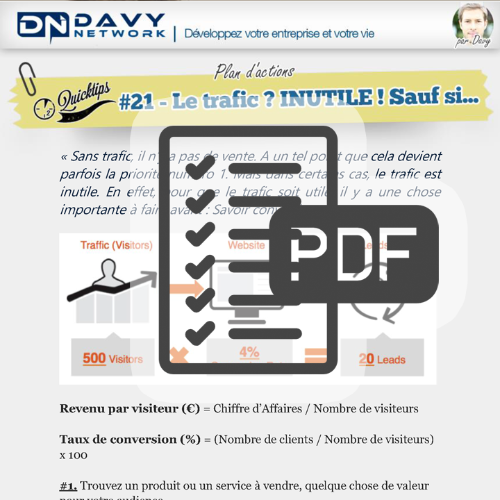 Et après une fois que vous avez un entonnoir de conversion qui convertit, c'est à ce moment là que le trafic va intervenir. Vous connaîtrez votre maximum à investir et vous pourrez commencer à faire des Split-Tests (tester deux versions différentes d'une même page), afin d'essayer d'optimiser ce taux de conversion. Et un meilleur taux de conversion, veut dire plus d'argent à investir en publicité. Dans le plan d'actions du Quicktip téléchargeable en haut de l'article, je détaille davantage la procédure et je vous donne les formules, pour calculer les statistiques les plus importantes pour commencer à investir en publicité (ou investir en référencement, ou autre !). Quand vous en serez à ce point, vous découvrirez que avoir plus de trafic n'est plus vraiment un problème, mais que le vrai problème, c'est d'arriver à créer les conditions, permettant de générer plus de revenu que d'argent investi. Que ce soit sur le court, ou le long terme.Web-Entrepreneur et fondateur de le plate-forme de formations Davy Network, Davy aide les entrepreneurs et les marques depuis 2010, à développer leur entreprise sur le Web, grâce aux stratégies de Marketing Internet.